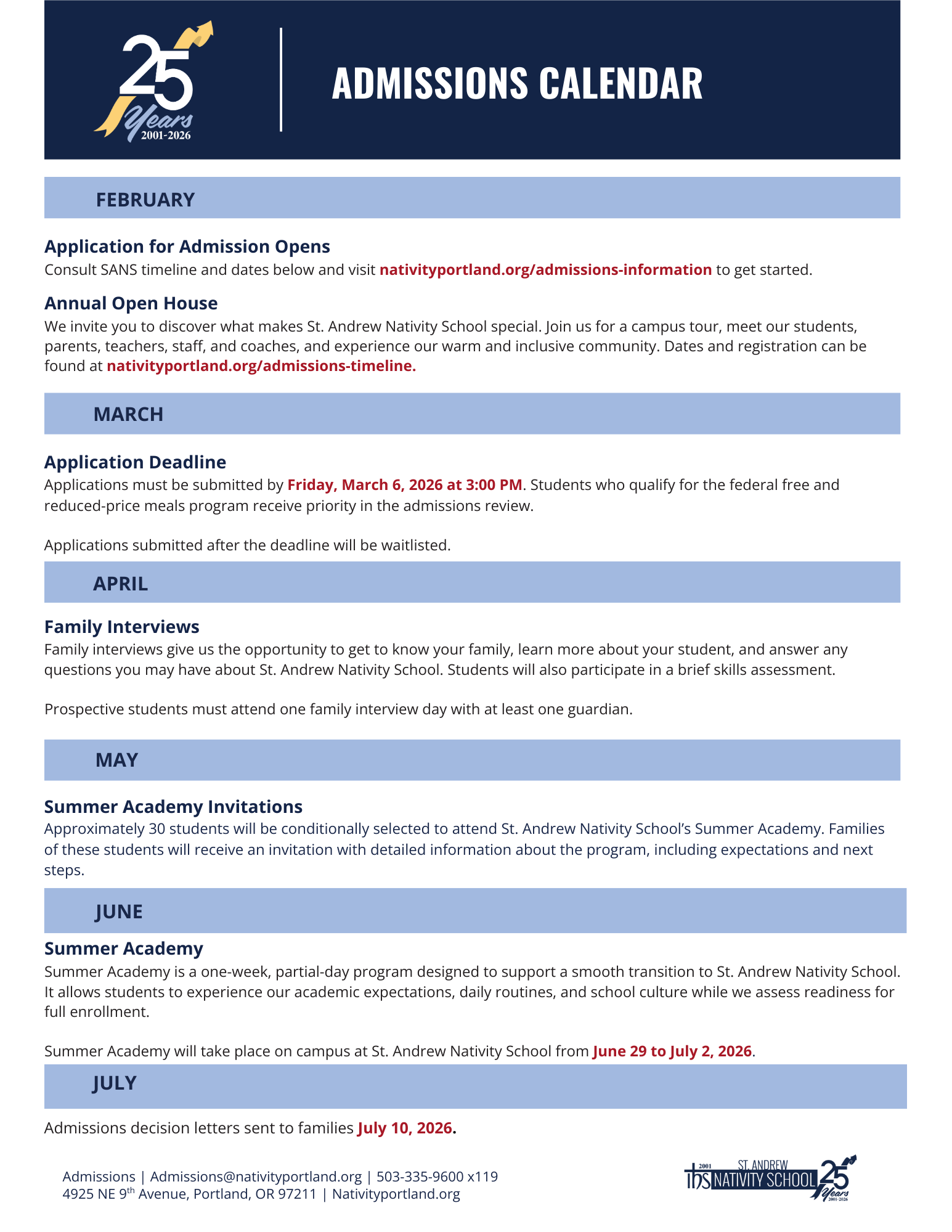 Admissions Timeline & Dates FOR School year 2026-27
